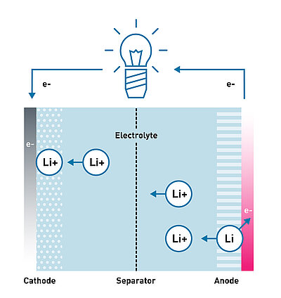 When charging a lithium-ion battery or lithium-ion accumulators, lithium ions are transported through the electrolyte layer from the cathode to the anode. In the anode, which is often made of graphite or other carbon-rich materials, the reversible intercalation of the lithium takes place with the absorption of electrons. When the battery is discharged, this process is reversed. The lithium-rich anode layer releases electrons and the resulting lithium ions are transported to the cathode. The resulting current flow can be used by electrical consumers. This cycle can be repeated several times in rechargeable batteries, although certain memory effects are inevitable. The higher the quality of the battery and the materials used in it, such as lithium iron phosphate, the longer the service life can be.